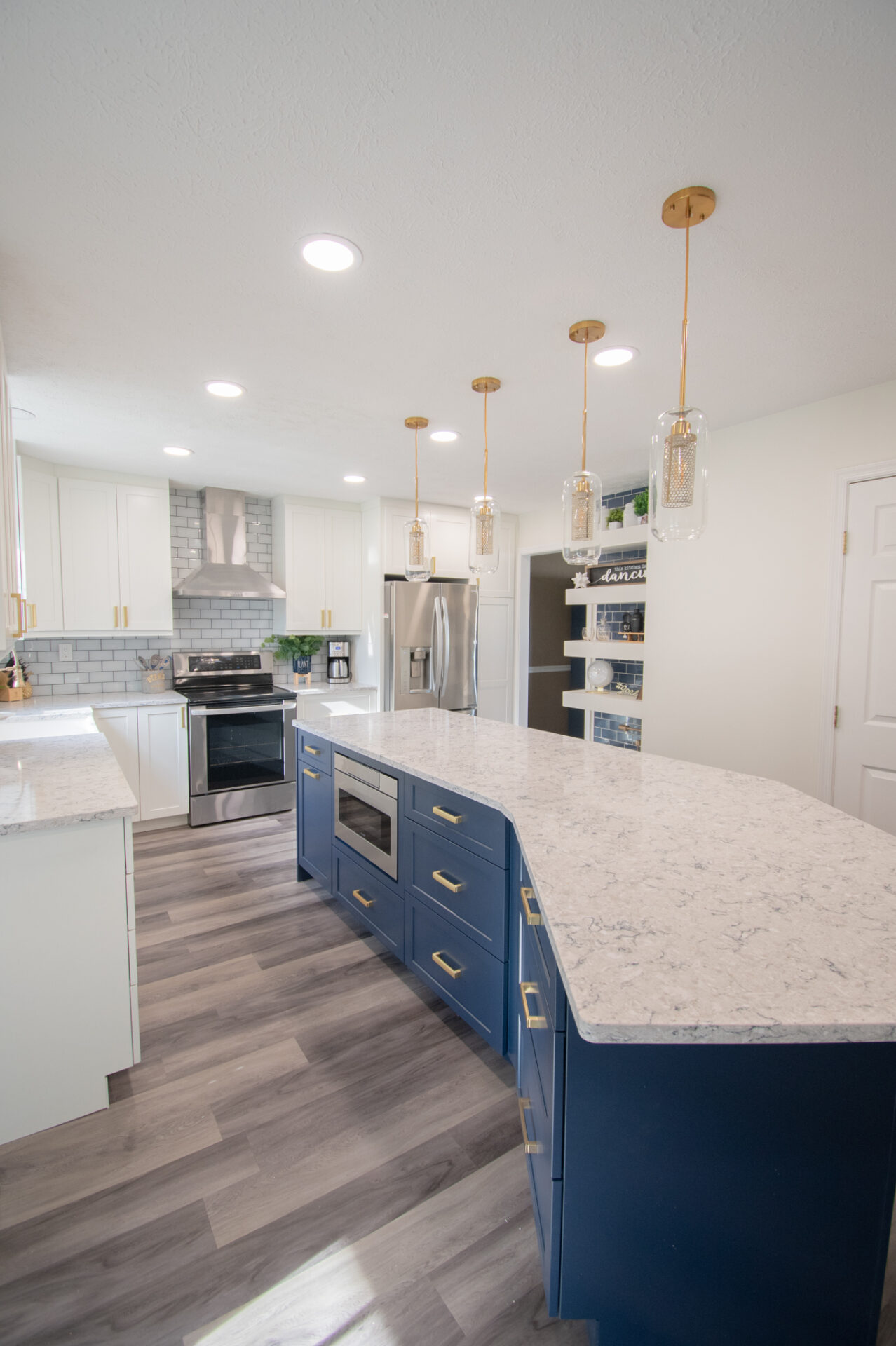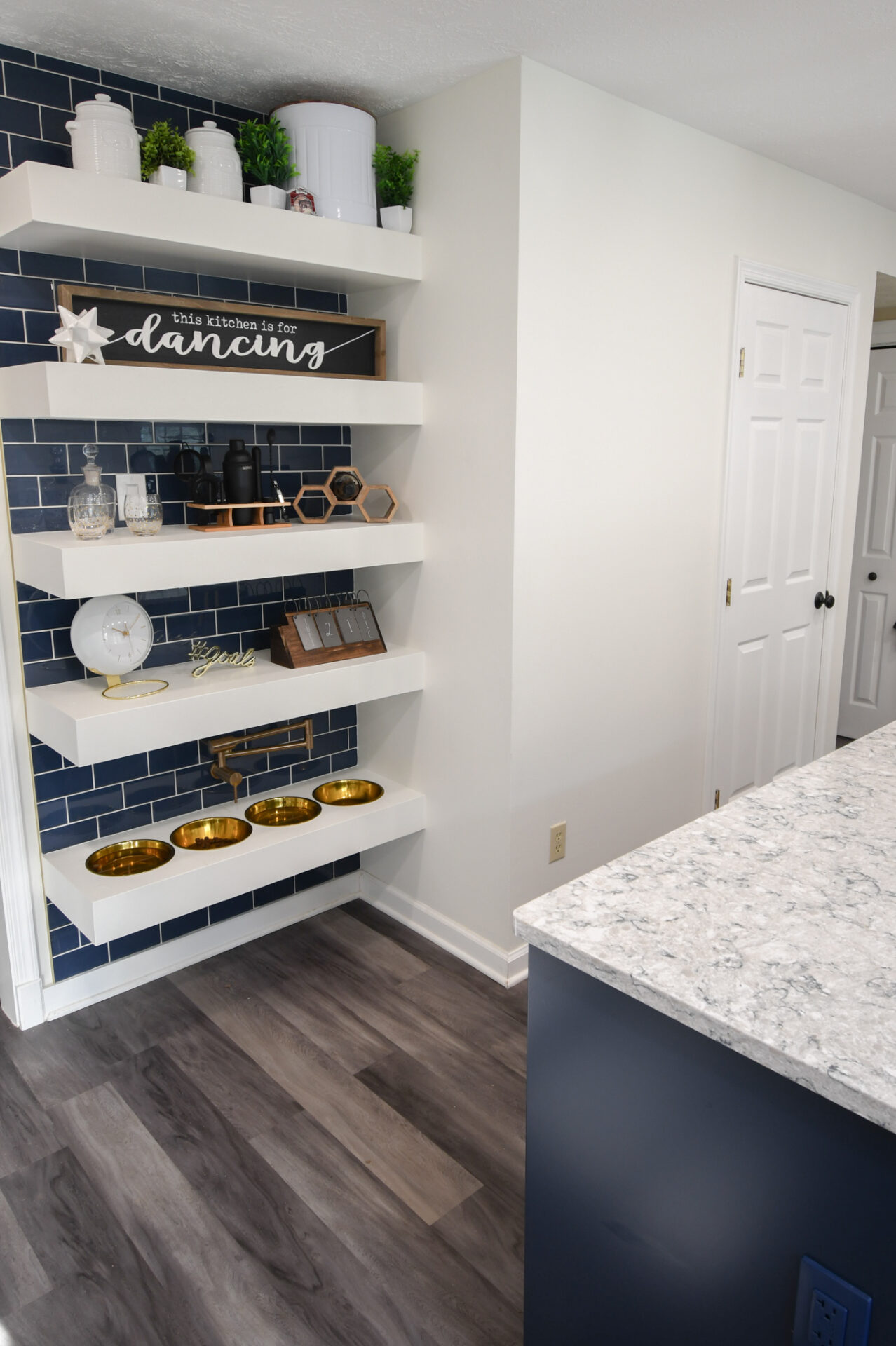 Now you might have noticed behind the island, shelving with coordinating blue tile.