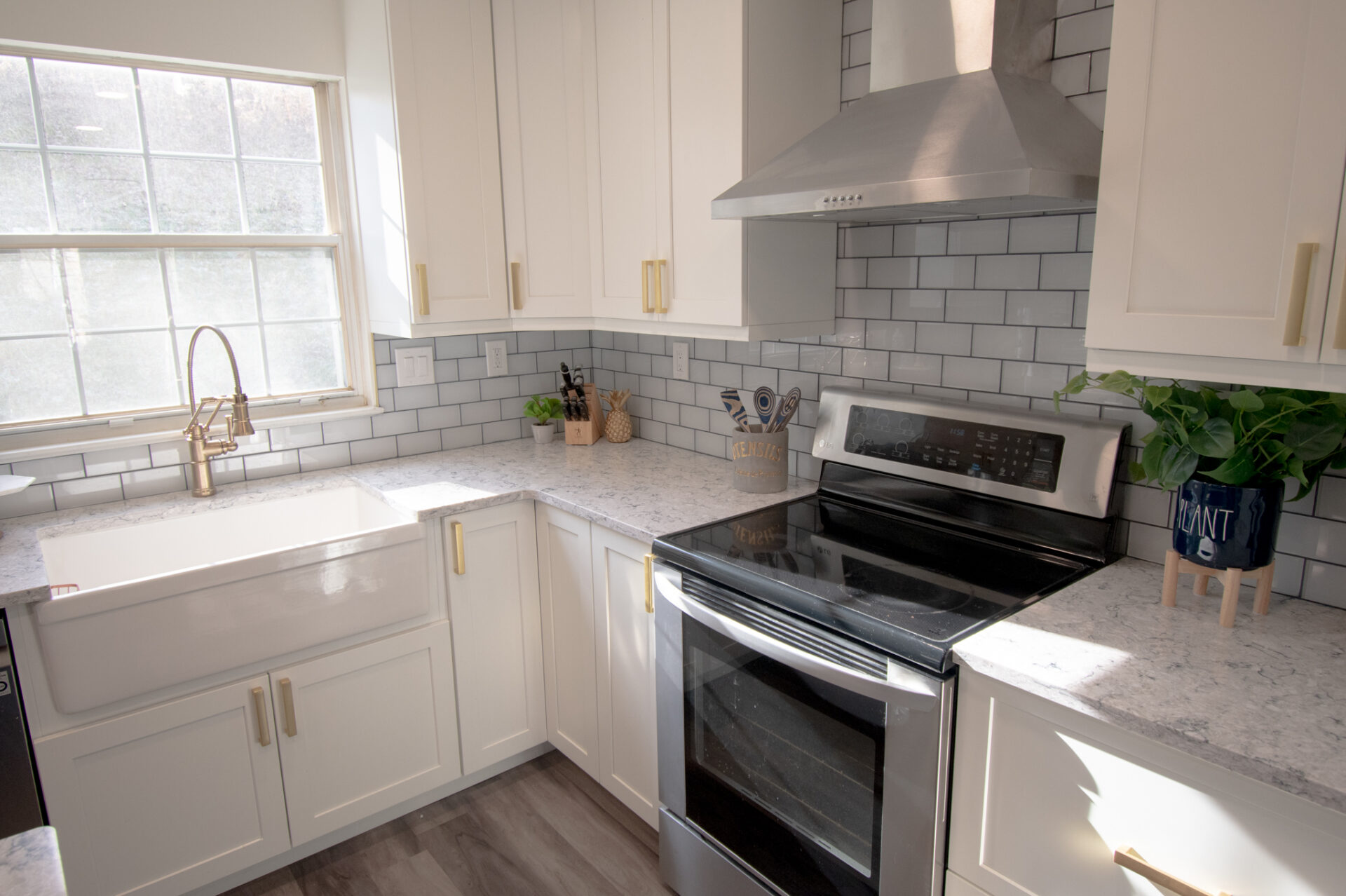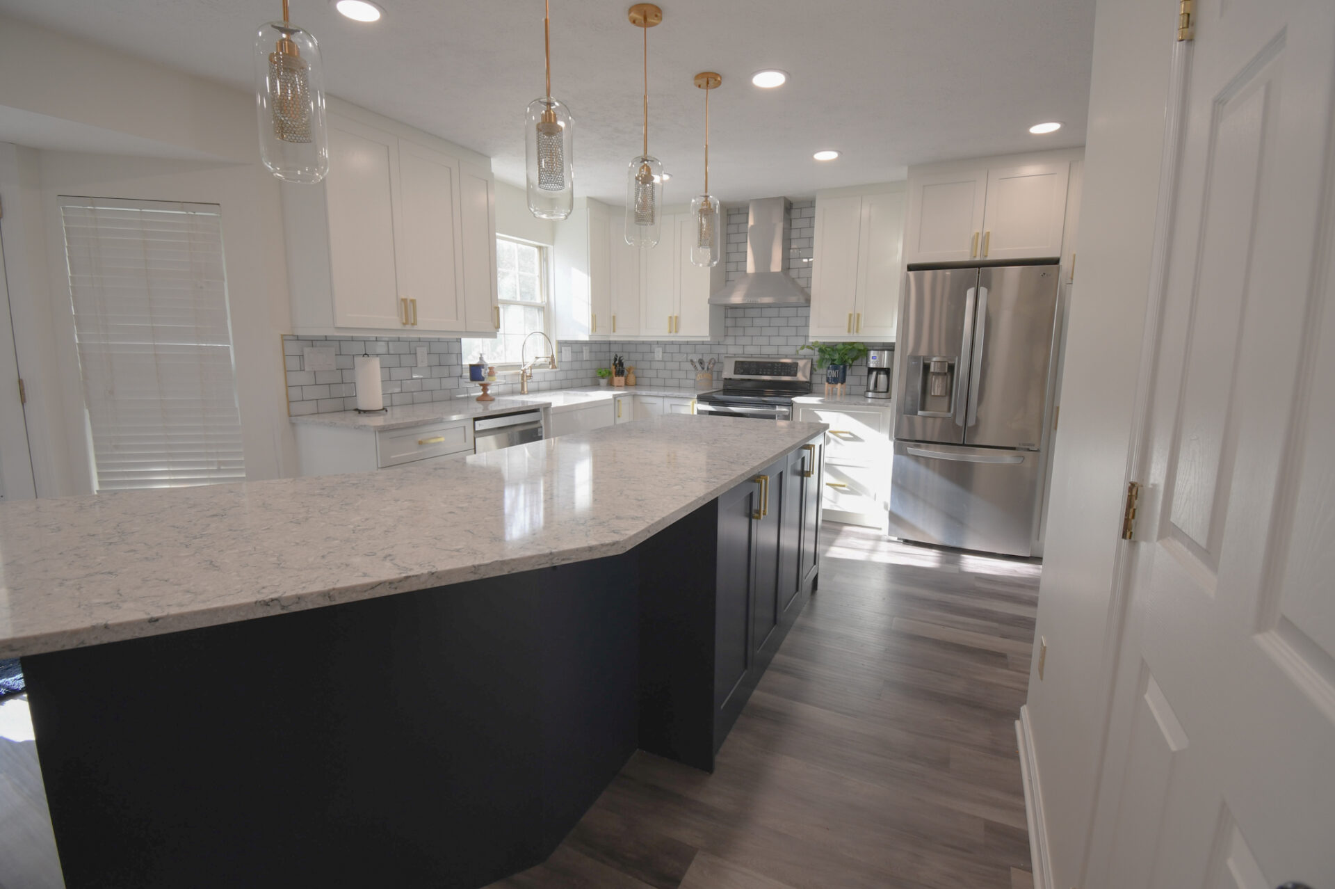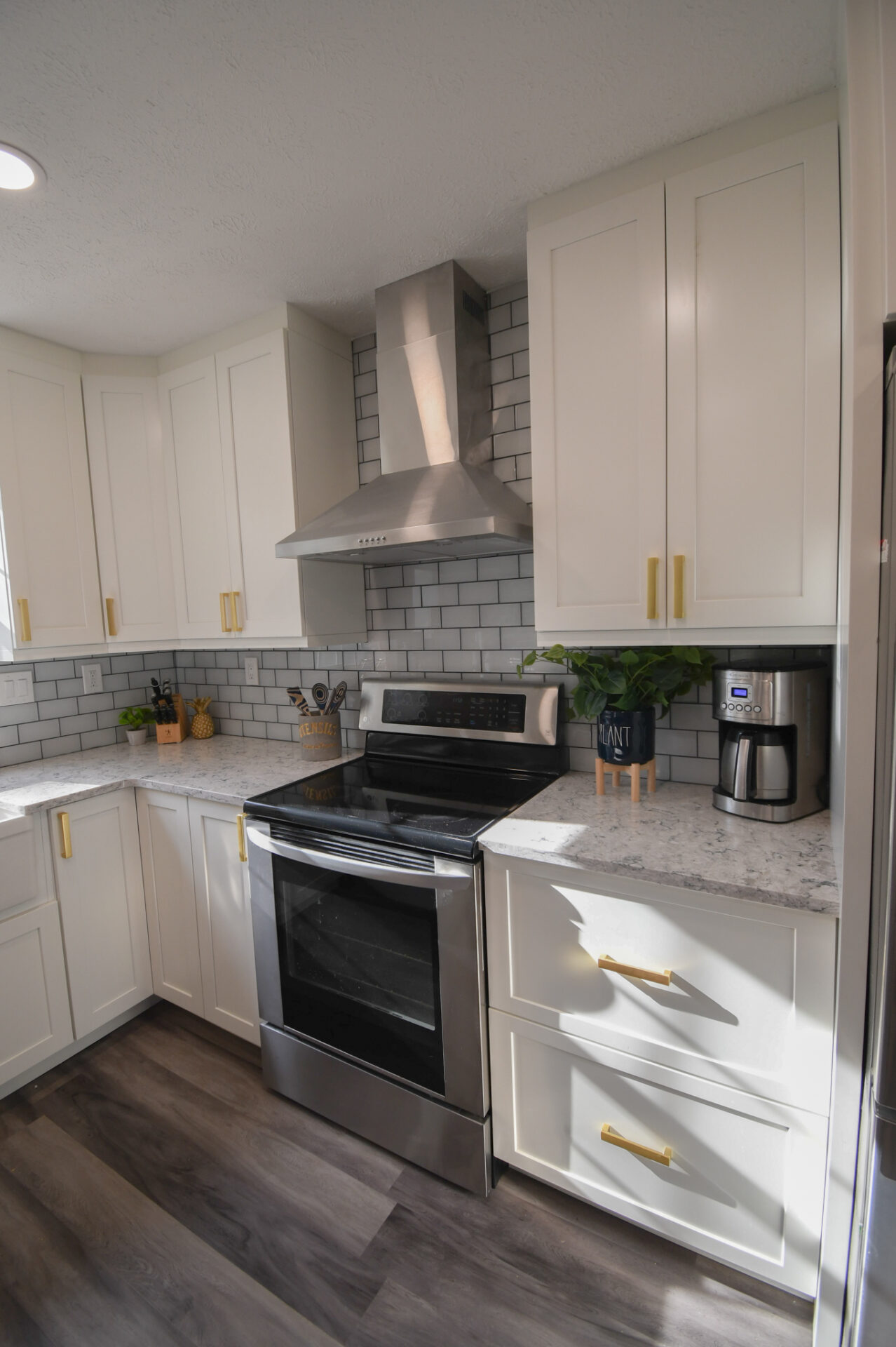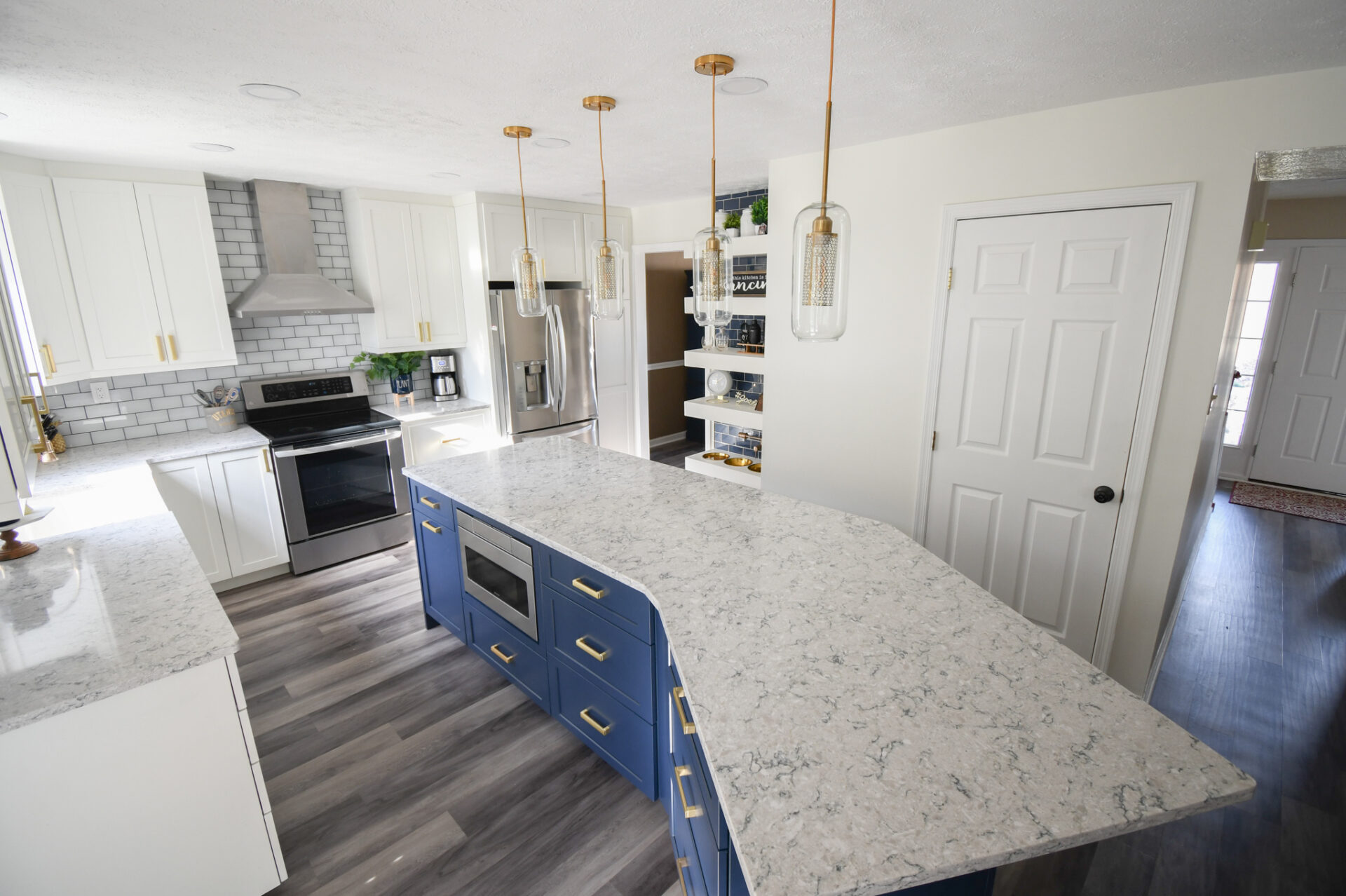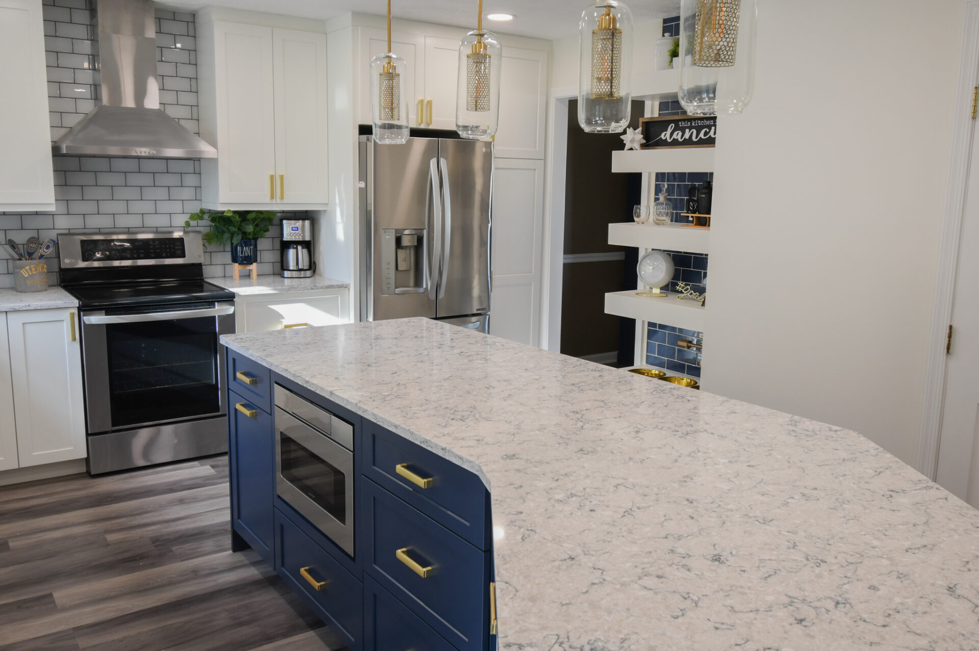 The expanded island also made space for us to move the microwave from above the stove to the island so we could add in a modern stove hood which really added some WOW factor to the space: