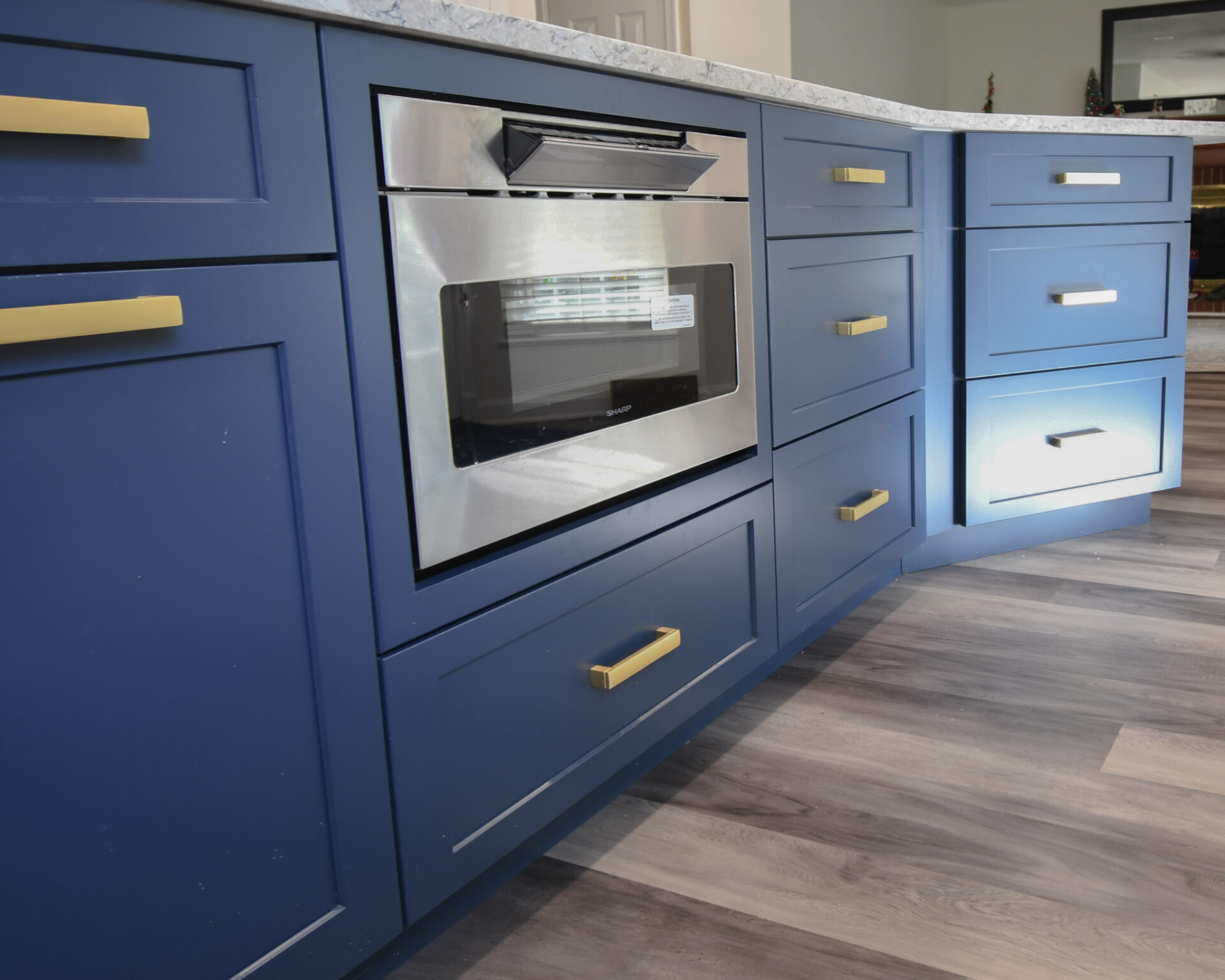 You might have noticed in the before photos that the old kitchen had a tiny island which reserved some space for a small dining table adjacent to the kitchen. Our Dreamers liked having a place to sit but needed more storage for kitchen items and more counterspace for food prep. We took these requirements and elongated the island into the former “eat in kitchen” area.